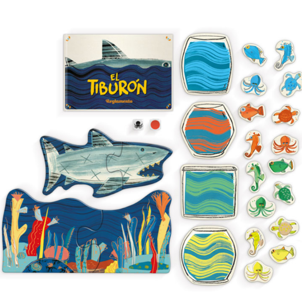 Tenemos cuatro peceras llenas de animales separados por colores y debemos liberarlos al océano. ¡Pero ojo! ¡Un tiburón anda al acecho! Tiramos los dados y éstos nos indican qué animal y color podemos liberar al océano o dejar en la panza del tiburón, según la suerte. ¡Pero entre todos podemos salvar a los animales! Si salen 2 tiburones, todos quedan libres. Un juego de mesa simple y didáctico para que lo más chicos aprendan a ser pacientes, a seguir reglas y a cooperar con el otro.