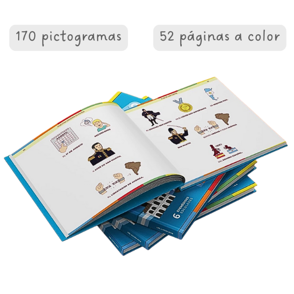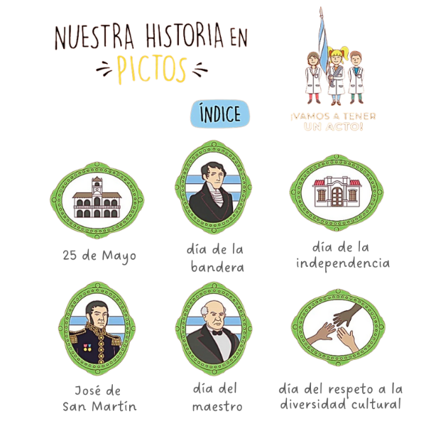 Nuestra historia en pictos es un libro destinado a niños de Nivel Inicial y Primario, en el que las efemérides escolares están narradas a través de oraciones cortas, sencillas, en imprenta mayúscula, y con el acompañamiento de apoyos visuales a lo largo de todo el relato para favorecer la comprensión del texto.